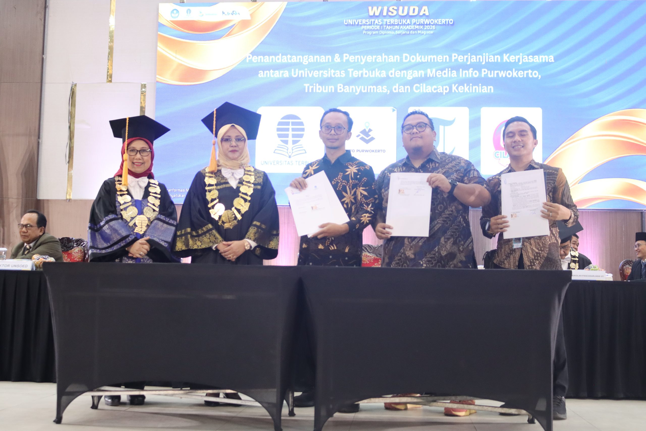 Selain prosesi wisuda, rangkaian kegiatan juga diisi dengan penandatanganan dokumen Perjanjian Kerja Sama (PKS) antara UT dengan sejumlah mitra strategis. Kerja sama dilakukan dengan Fakultas Perikanan dan Ilmu Kelautan Unsoed, PT Prima Karya Sarana Sejahtera, Media Info Purwokerto, Cilacap Kekinian, dan Tribun Banyumas. Kolaborasi ini bertujuan memperkuat jejaring UT dengan dunia akademik, industri, dan media dalam meningkatkan kualitas layanan pendidikan dan promosi institusi.